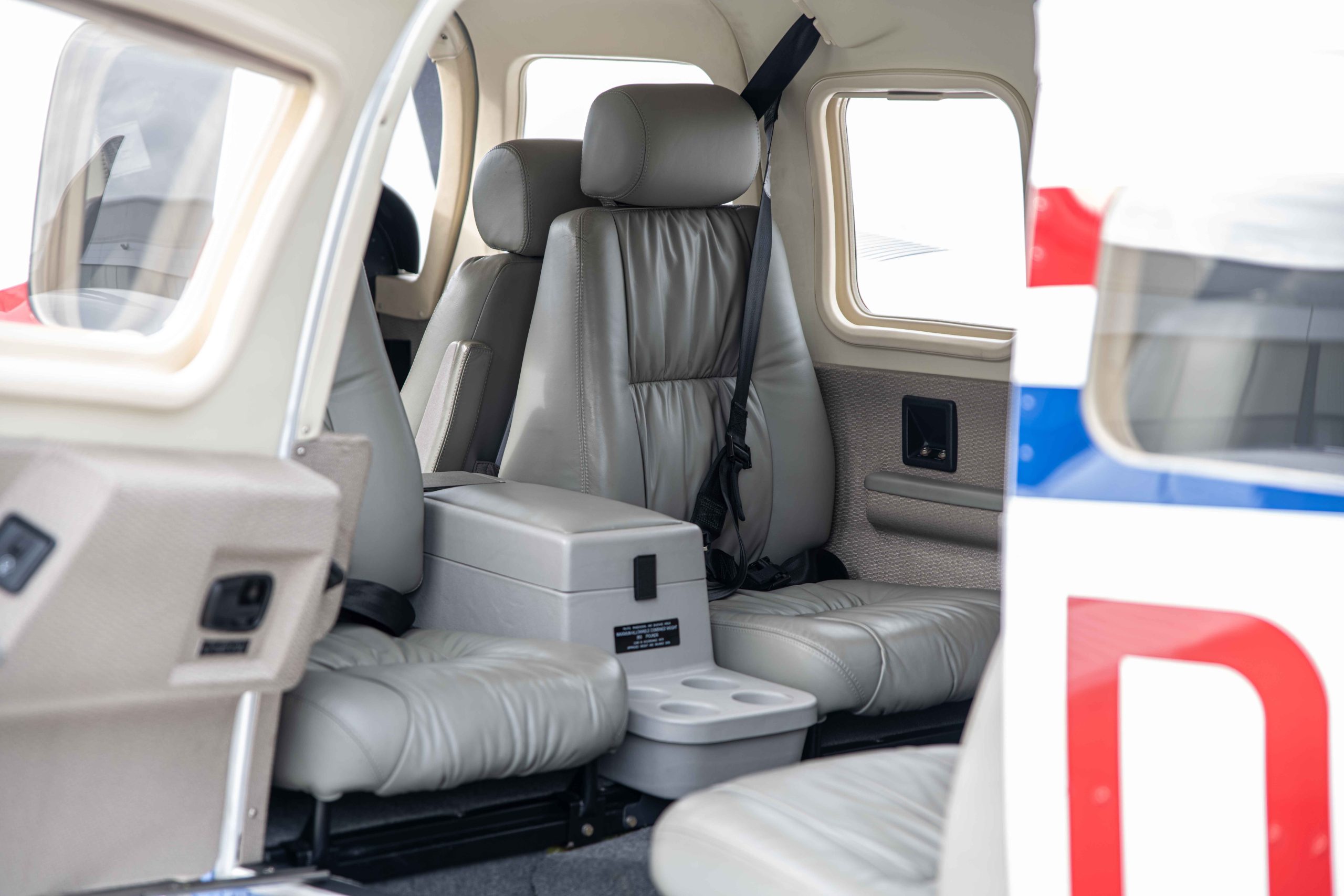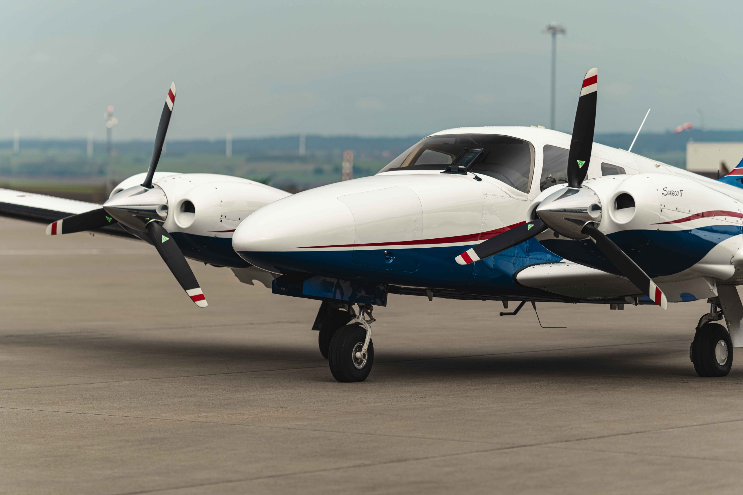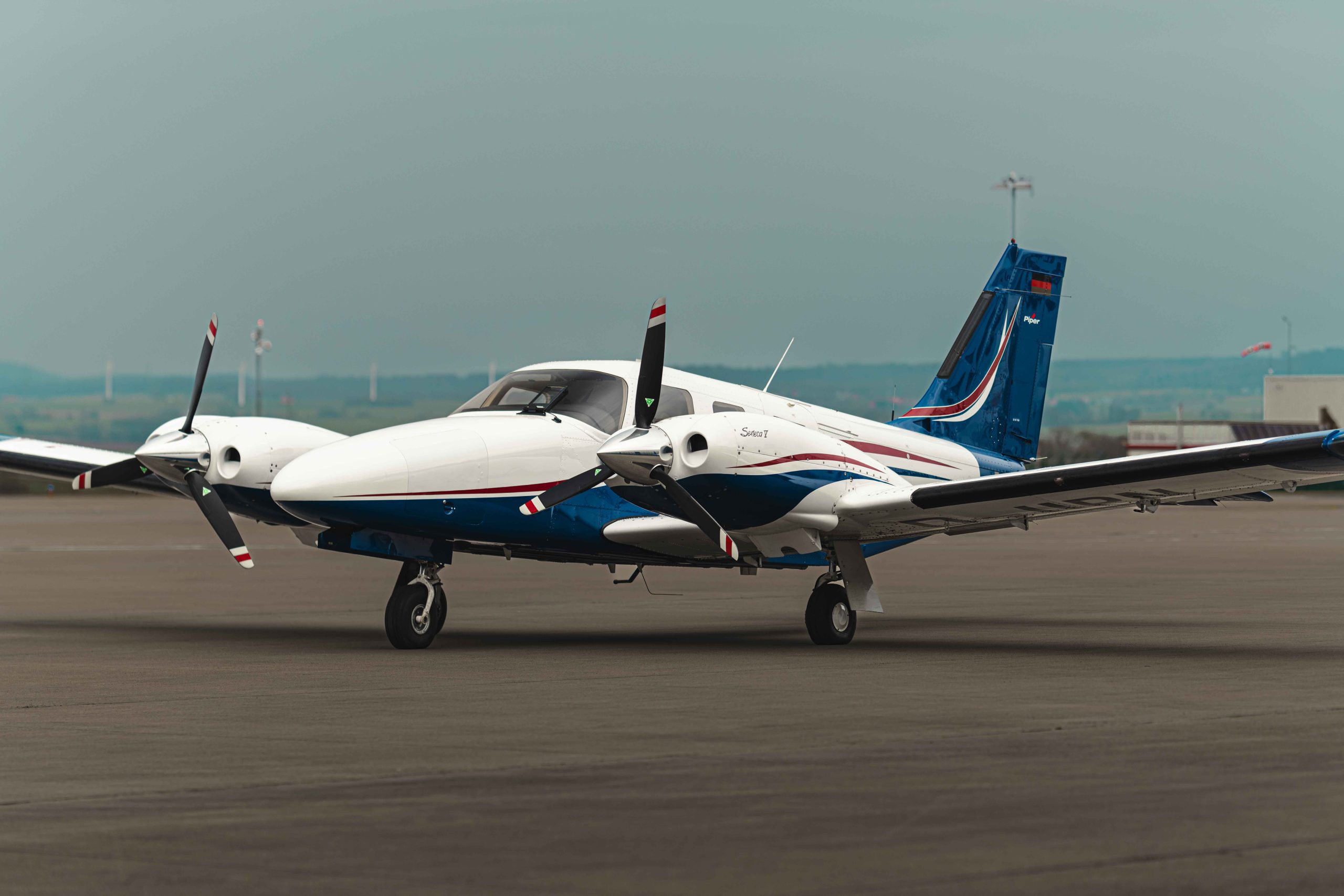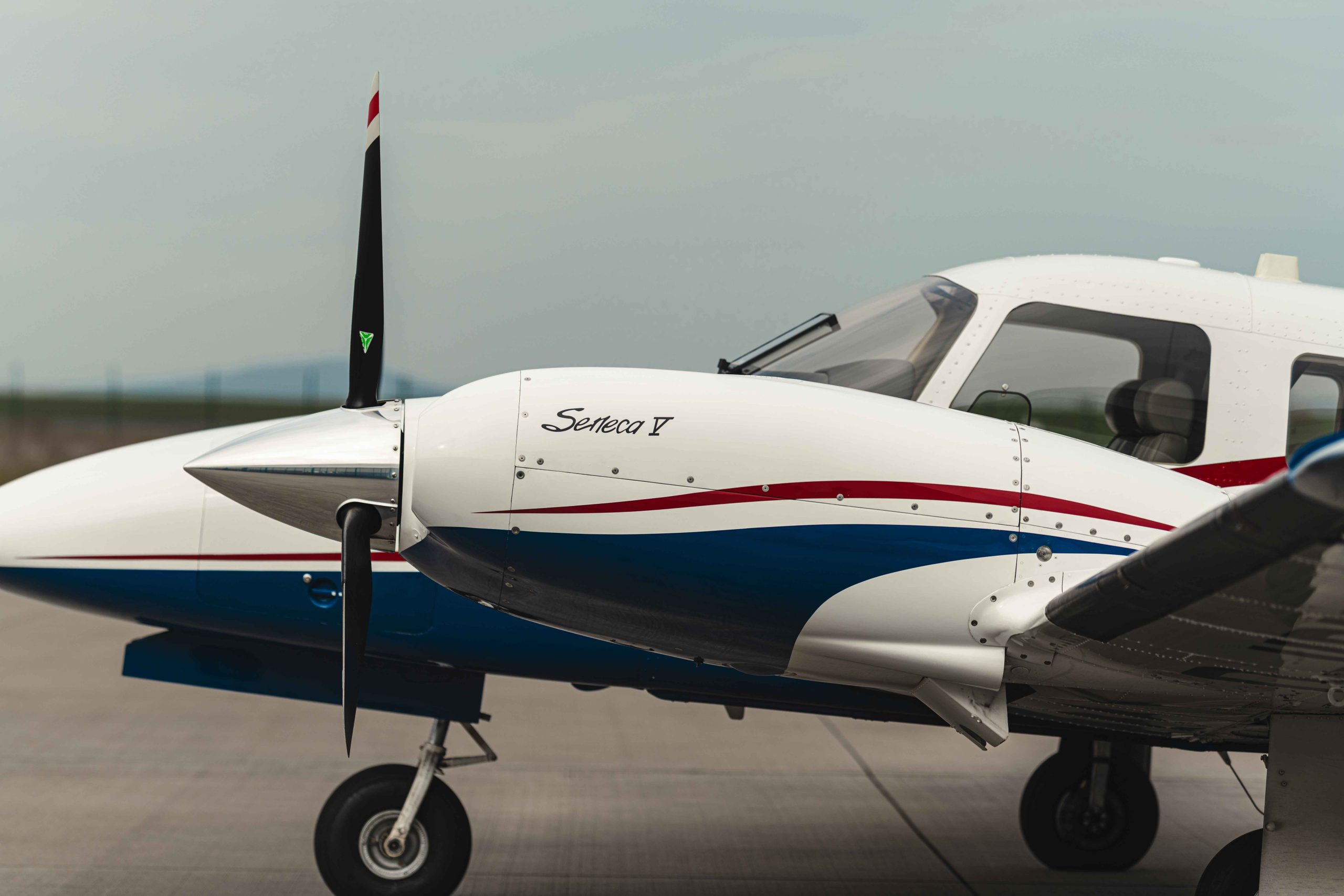 Die Lackierung in Matterhorn White / Royal Blue mit Deep Red Akzentstreifen verleiht dem Flugzeug eine elegante und zugleich markante Erscheinung. Das Interieur in Steel-farbenem Leder unterstreicht den hochwertigen und professionellen Charakter dieser späten Seneca V Generation.